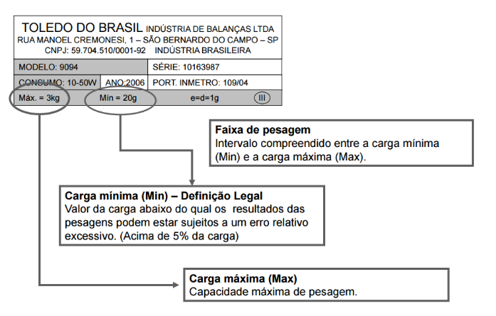 A carga máxima representa a capacidade máxima, sem considerar a capacidade aditiva de tara. A carga mínima é o valor de carga abaixo do qual os resultados das pesagens podem estar sujeitos a um erro relativo excessivo. O valor de divisão real (d) representa o valor da diferença entre duas indicações consecutivas, para uma indicação digital, e da diferença entre os valores correspondentes a duas marcas consecutivas para uma indicação analógica.  O valor de divisão de verificação (e) é o valor utilizado para a classificação e verificação de balanças.