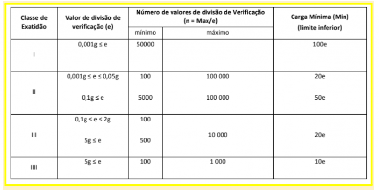 A identificação da classe de exatidão de uma balança também pode ser feita em acordo com a tabela de Classificação dos Instrumentos da portaria 157/22. Com as informações sobre a carga máxima, o valor de verificação é possível classificar a balança. Veja abaixo a tabela retirada da portaria e um exemplo de classificação.