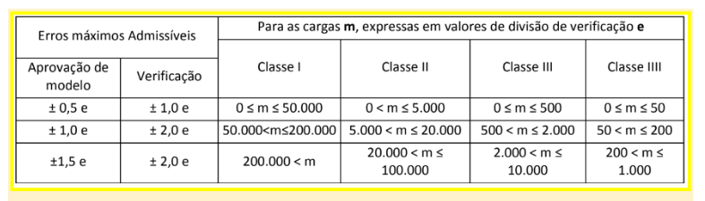 Os erros máximos admissíveis variam em acordo com a classe de exatidão da balança e com a faixa de pesagem. Vamos utilizar o mesmo exemplo acima para entender como determinar o erro máximo admissível.