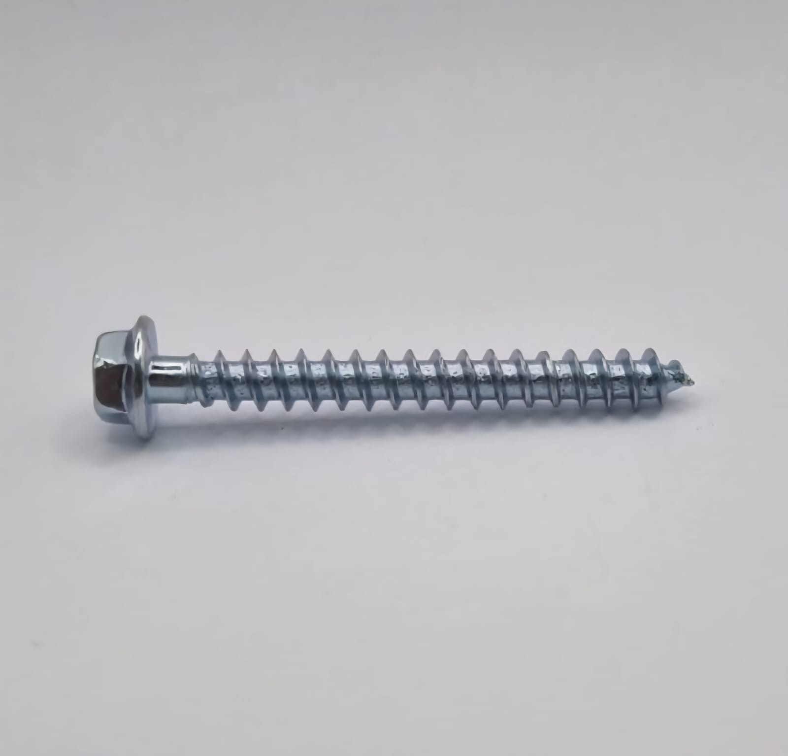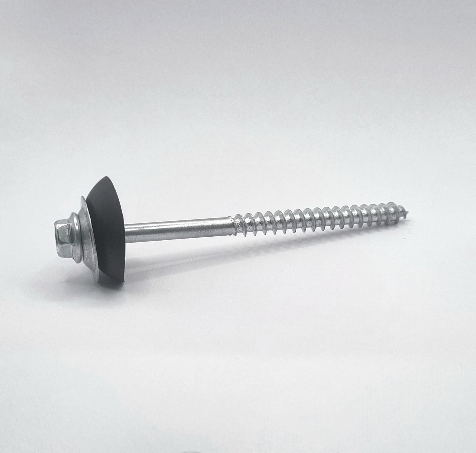 Parafuso em aço carbono com acabamento galvanizado e cabeça sextavada flangeada nº10. Conjunto de vedação composto por arruela metálica côncava galvanizada e arruela polimèrica flexível.
